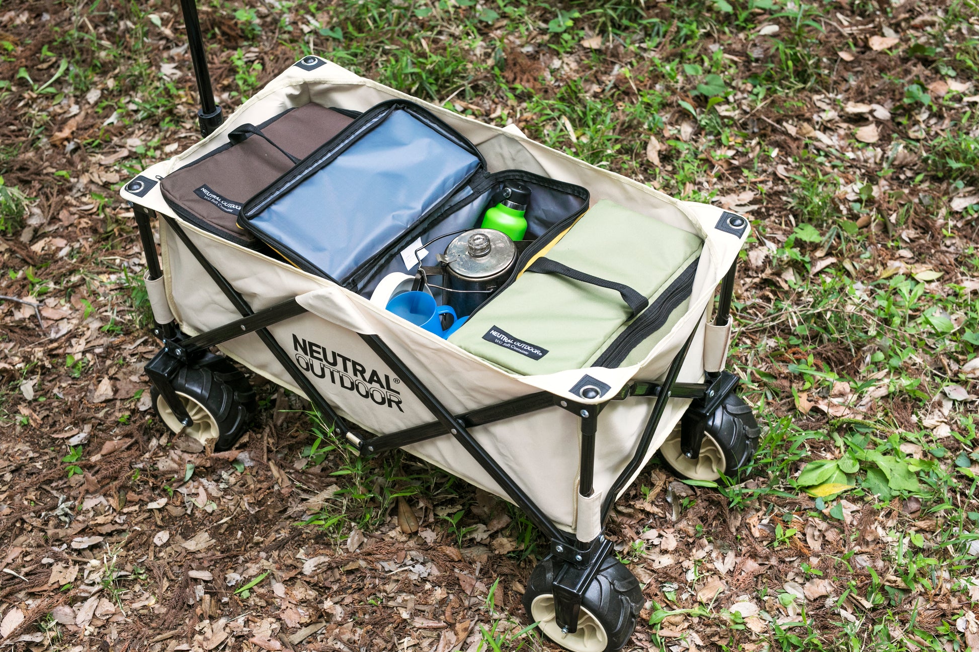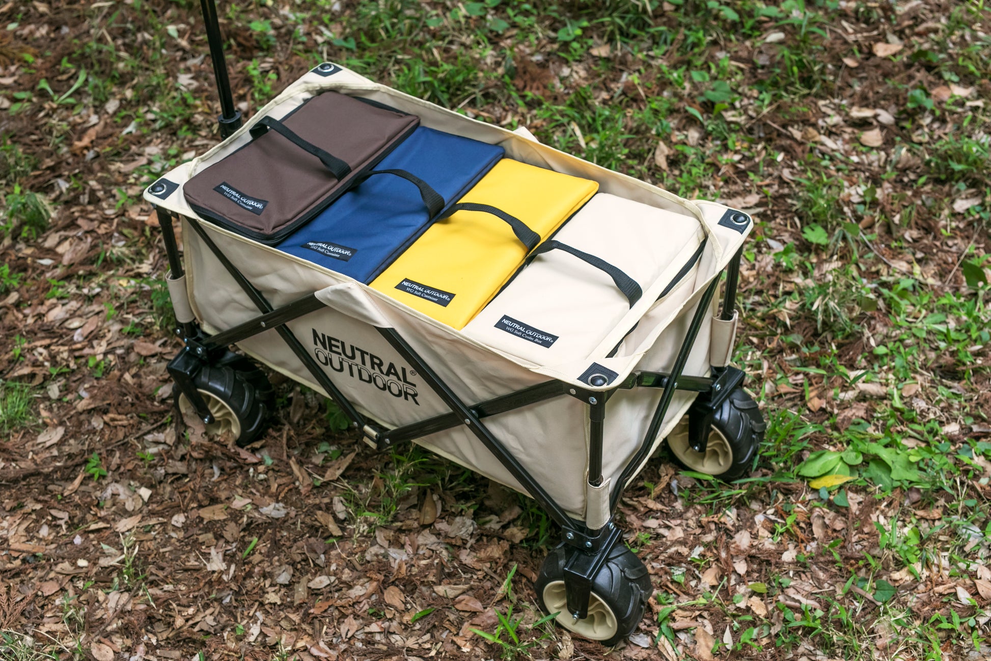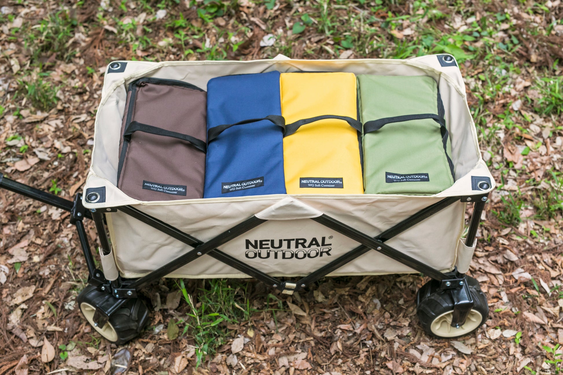 別売りのWGソフトコンテナー、WGソフトクーラーと合わせてご使用いただくことで、単なる運搬具からキャンプサイトでの機能的な移動型ストレージとなります。